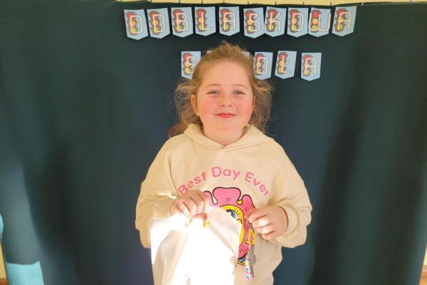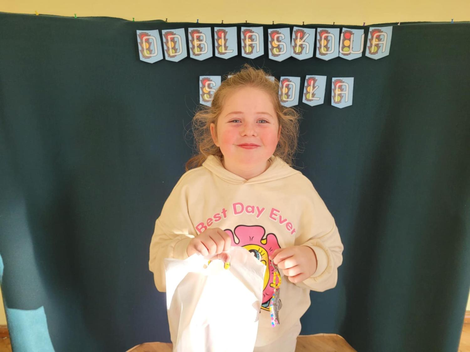 "Odblask noś, bądź jak gwiazda. Świeć jak księżyc, jasna jazda. Bezpieczeństwo nasza sprawa. Odblaskową super zabawa."