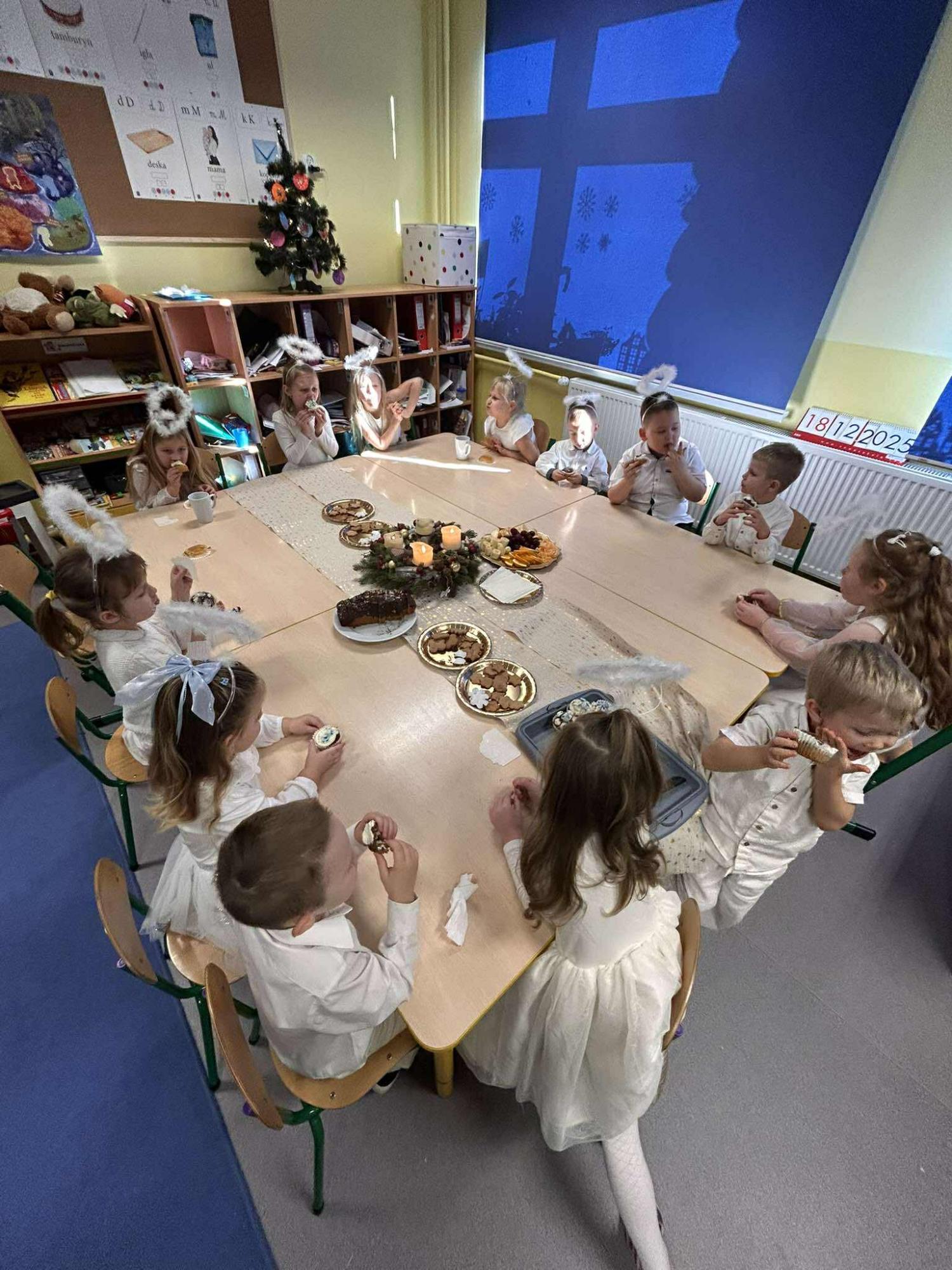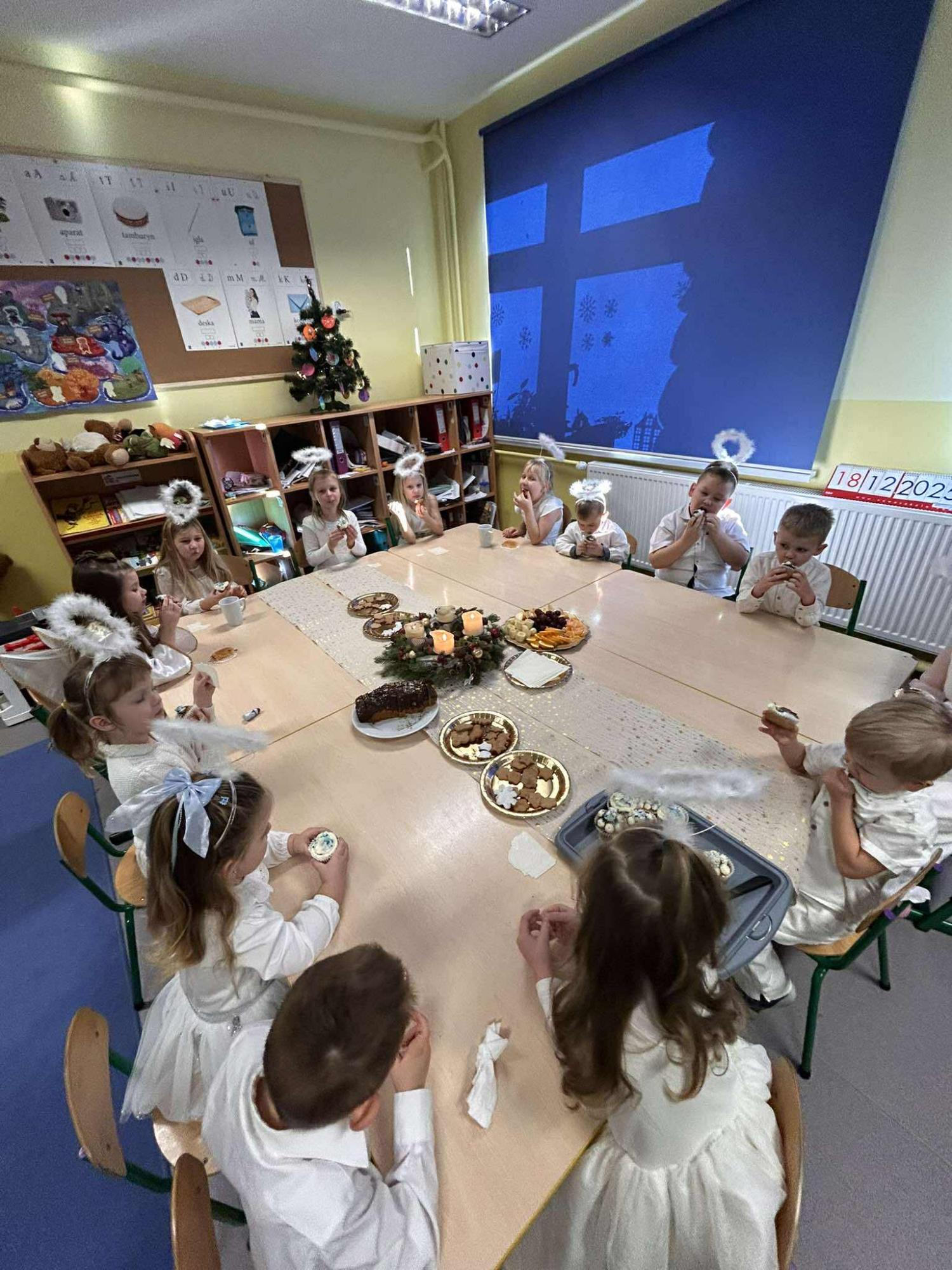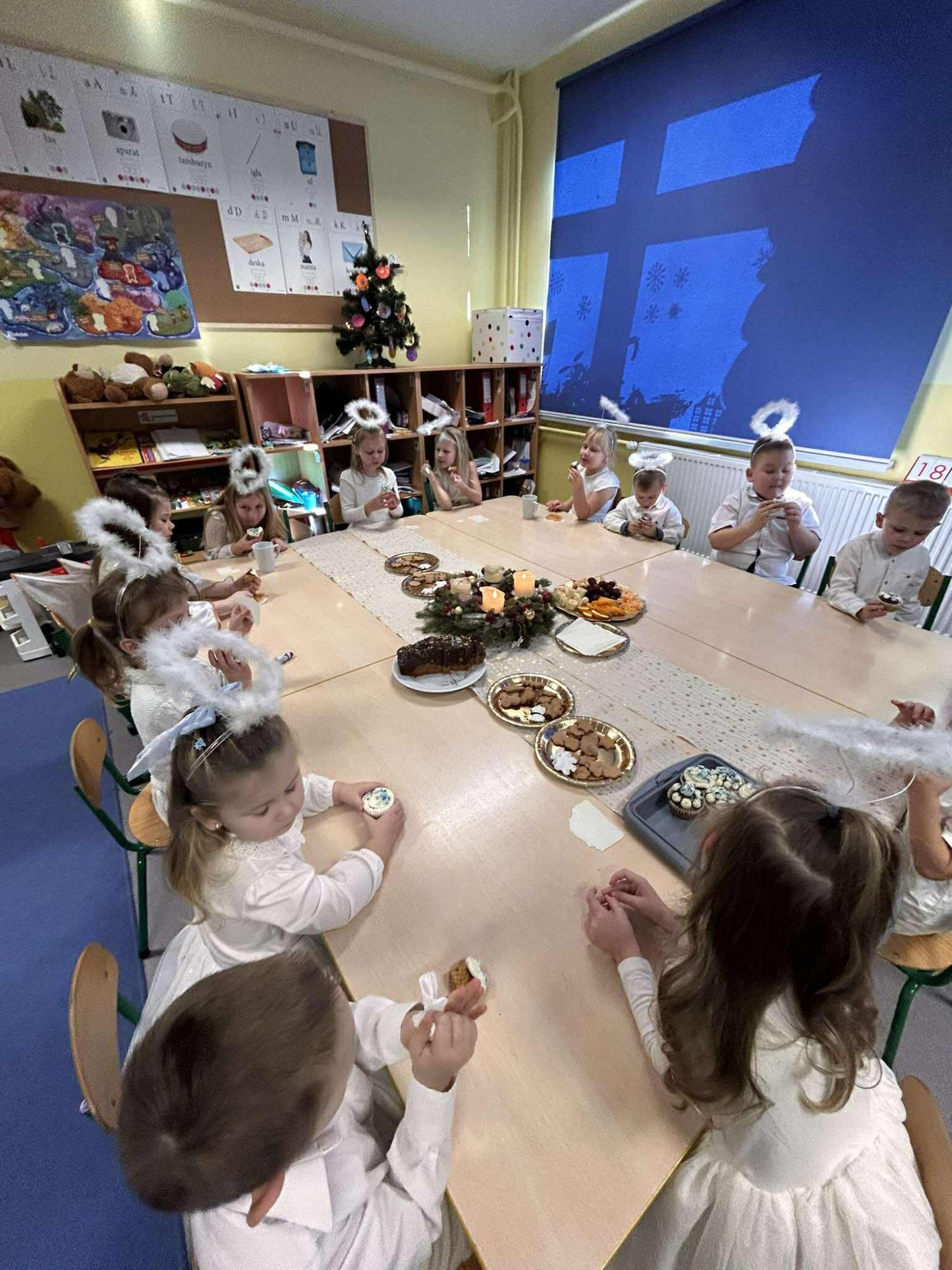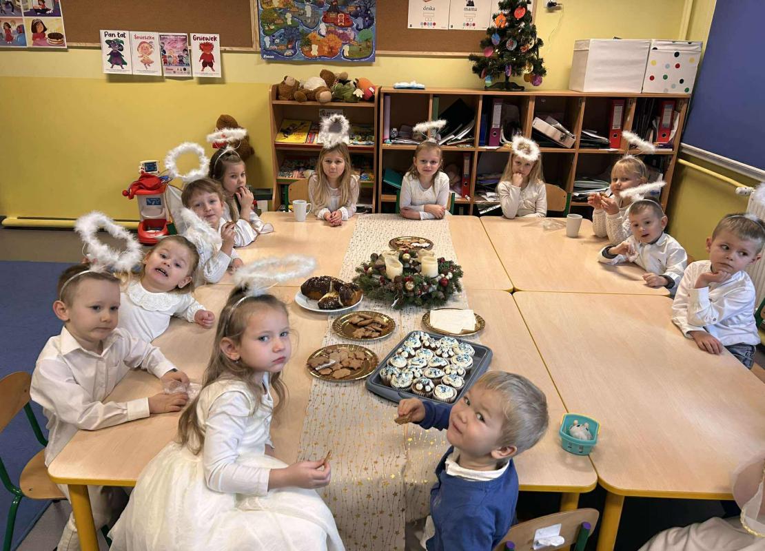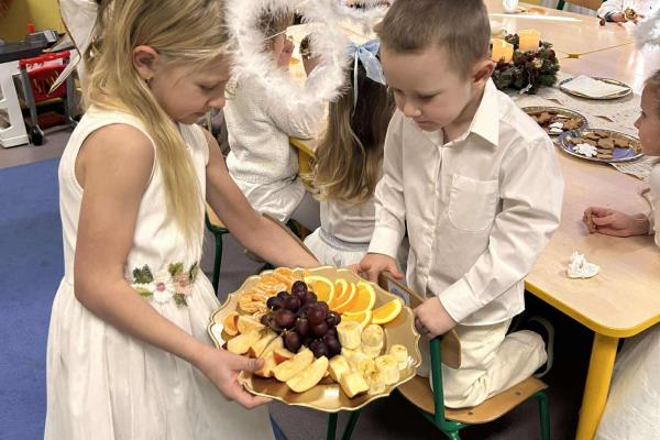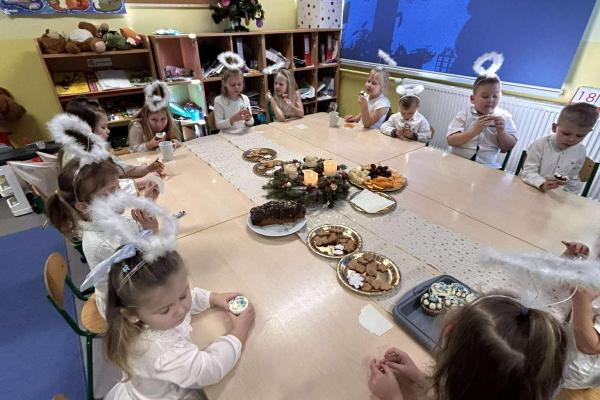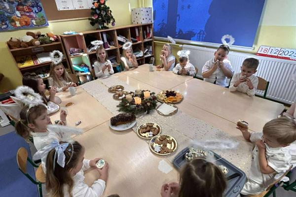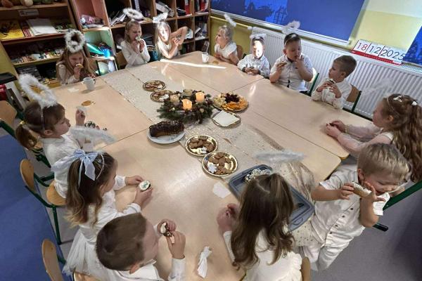W świątecznej atmosferze odbył się również bożonarodzeniowy poczęstunek wśród przedszkolaków. Dzieci wspólnie zasiadły do stołu, pełnego świątecznych smakołyków, a wyjątkowym momentem było dzielenie się opłatkiem, składanie sobie życzeń oraz rozmowy pełne życzliwości i uśmiechu.
