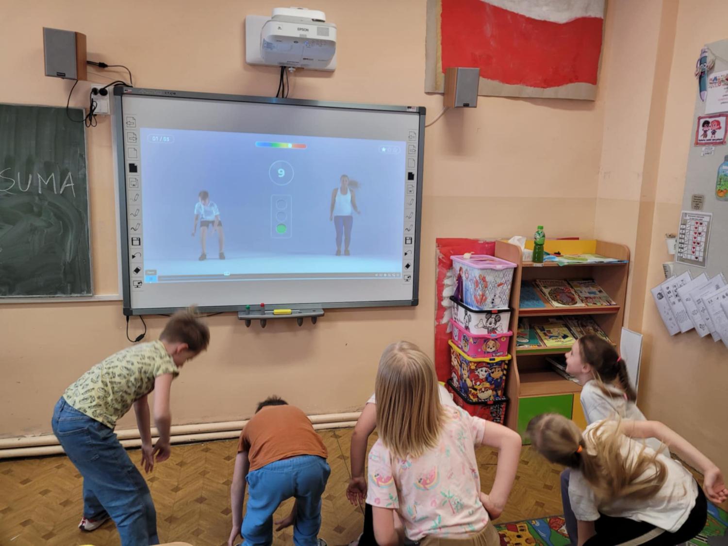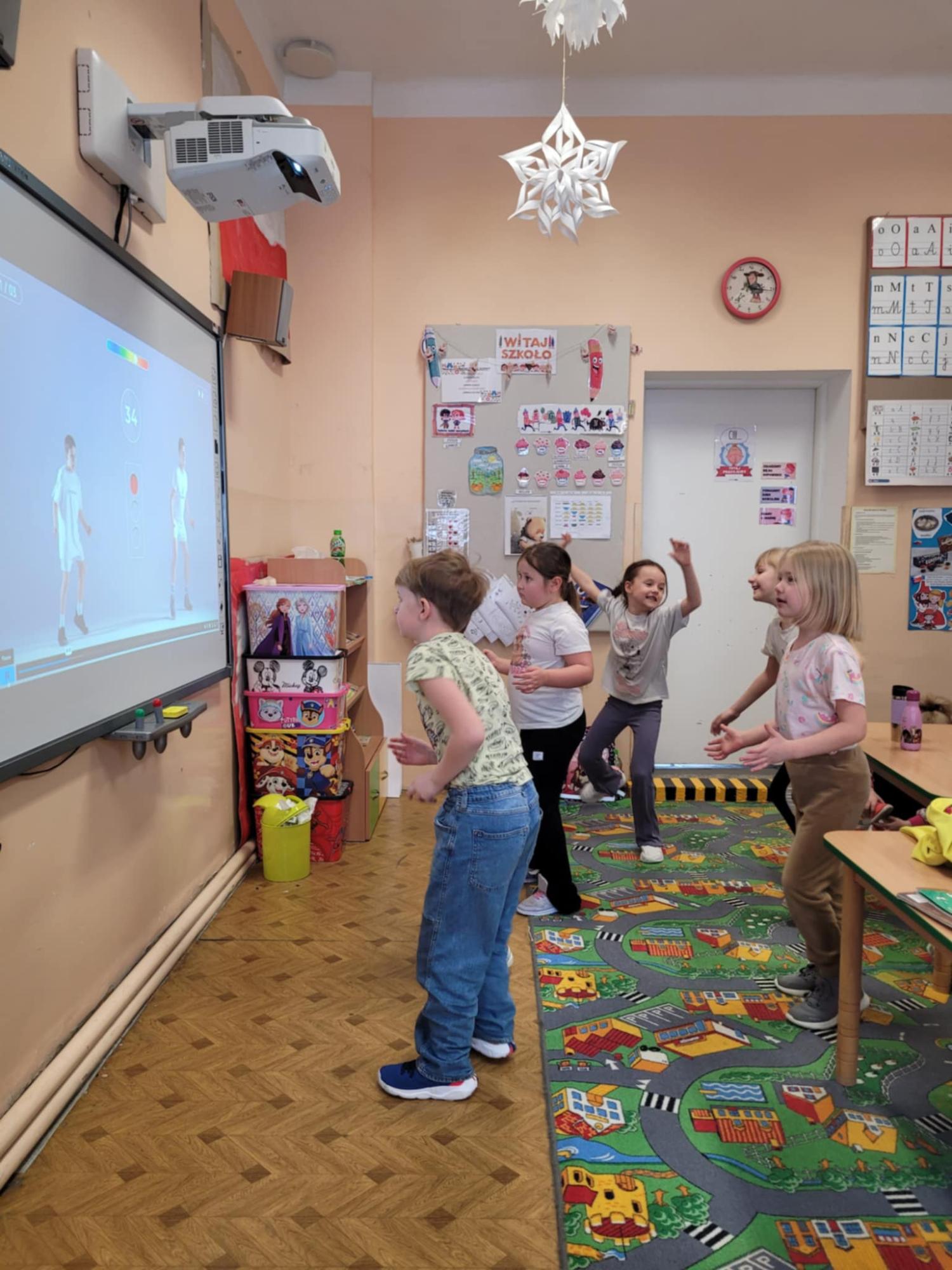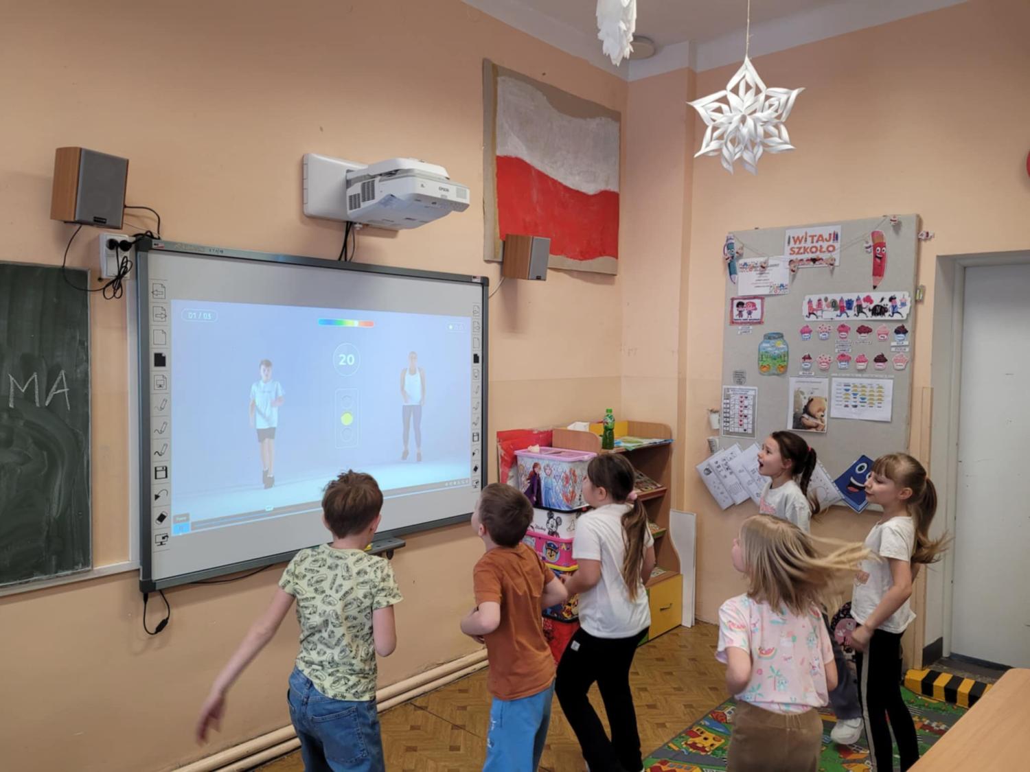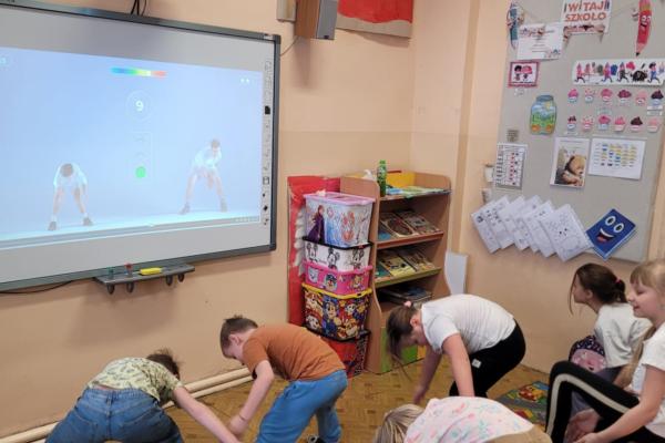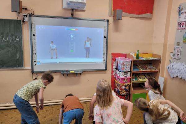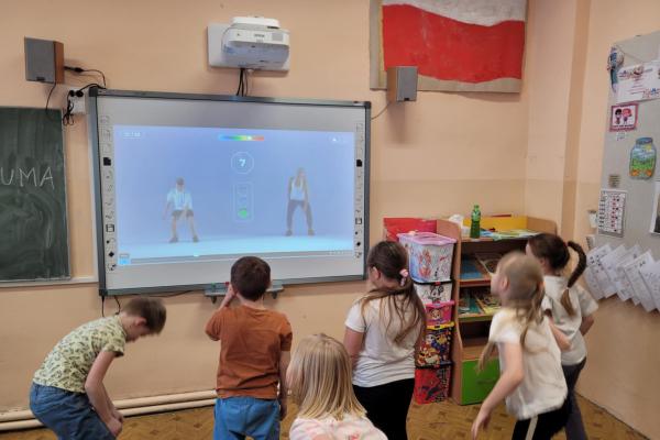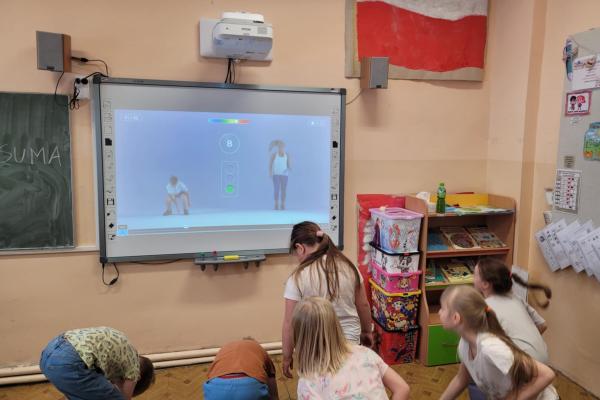 Czas spędzany w świetlicy to także nowoczesne formy nauki i zabawy – uczniowie aktywnie korzystają z tablicy interaktywnej, która pozwala łączyć edukację z atrakcyjną formą rozrywki.