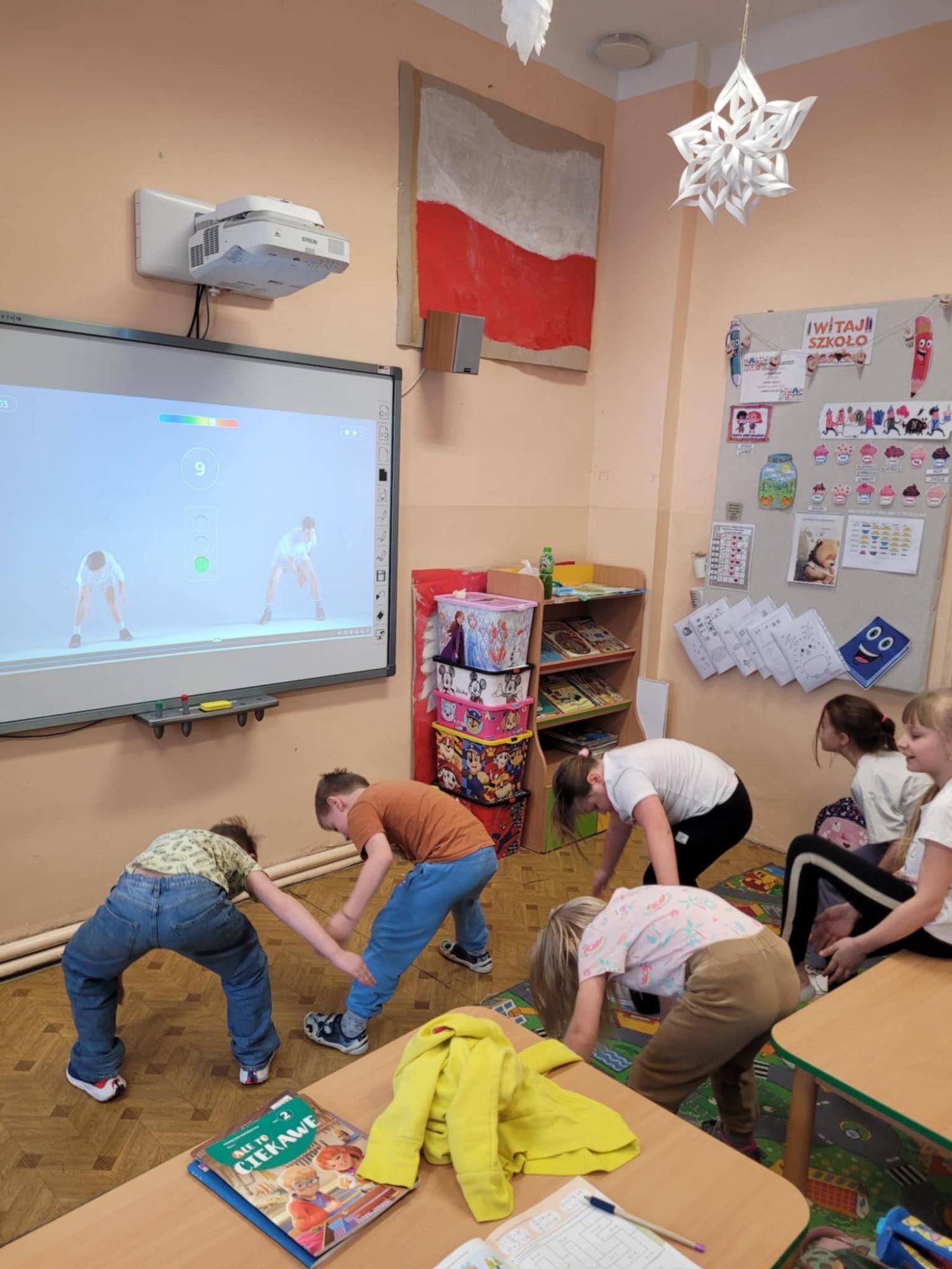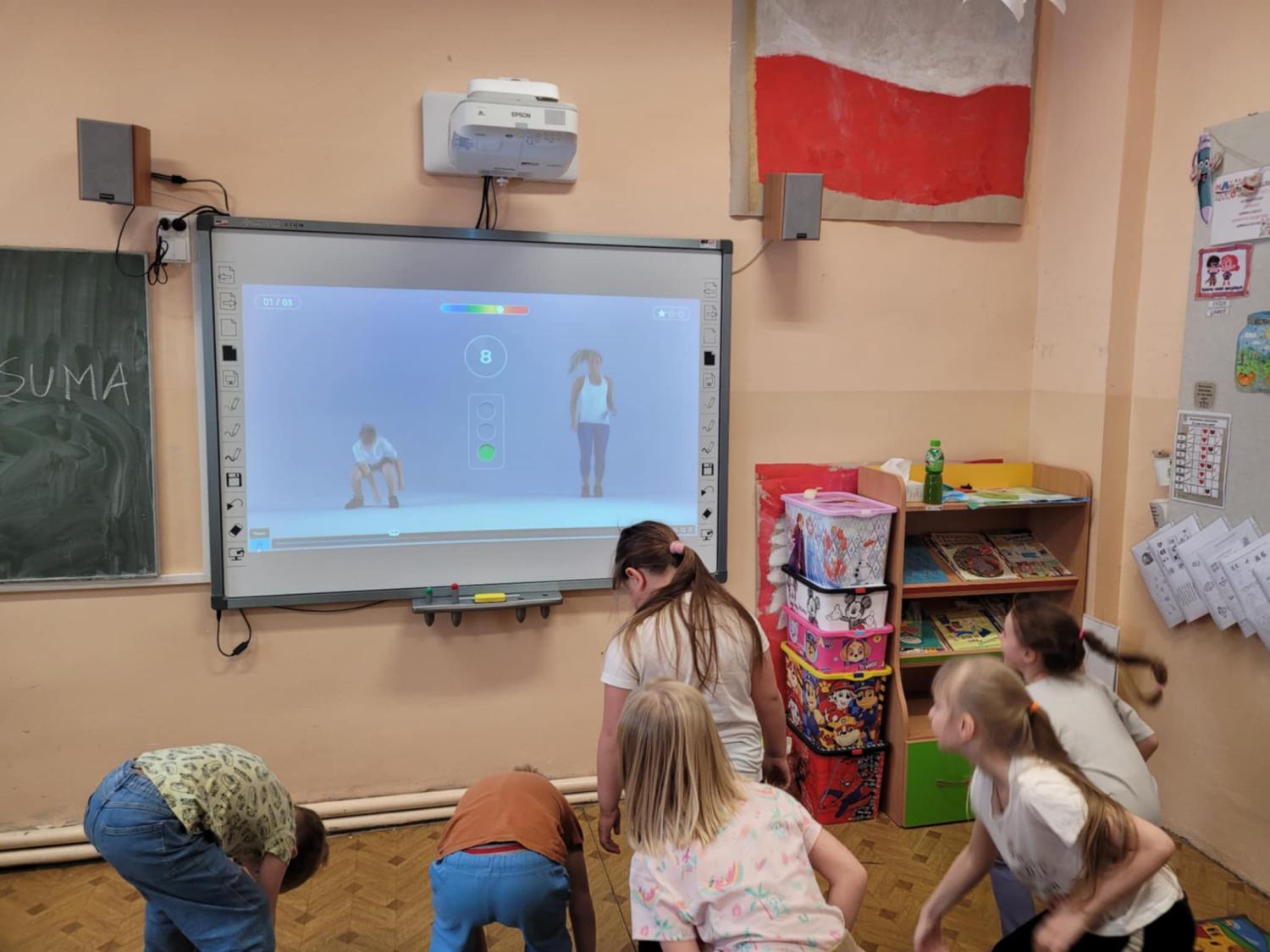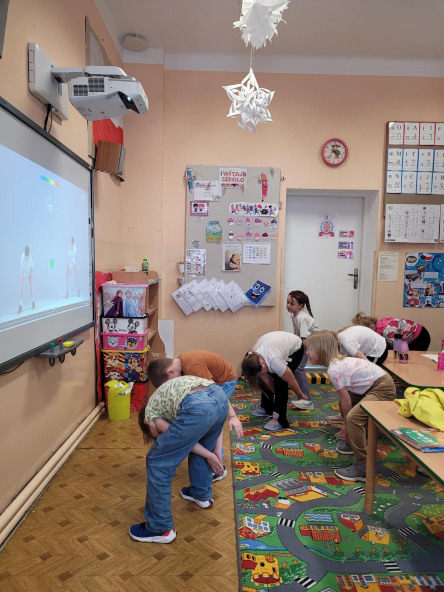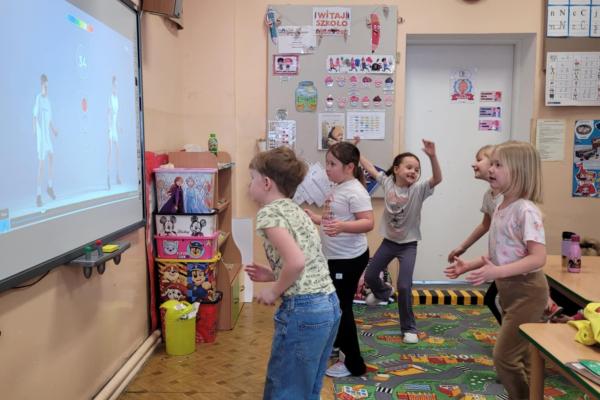 Czas spędzany w świetlicy to także nowoczesne formy nauki i zabawy – uczniowie aktywnie korzystają z tablicy interaktywnej, która pozwala łączyć edukację z atrakcyjną formą rozrywki.