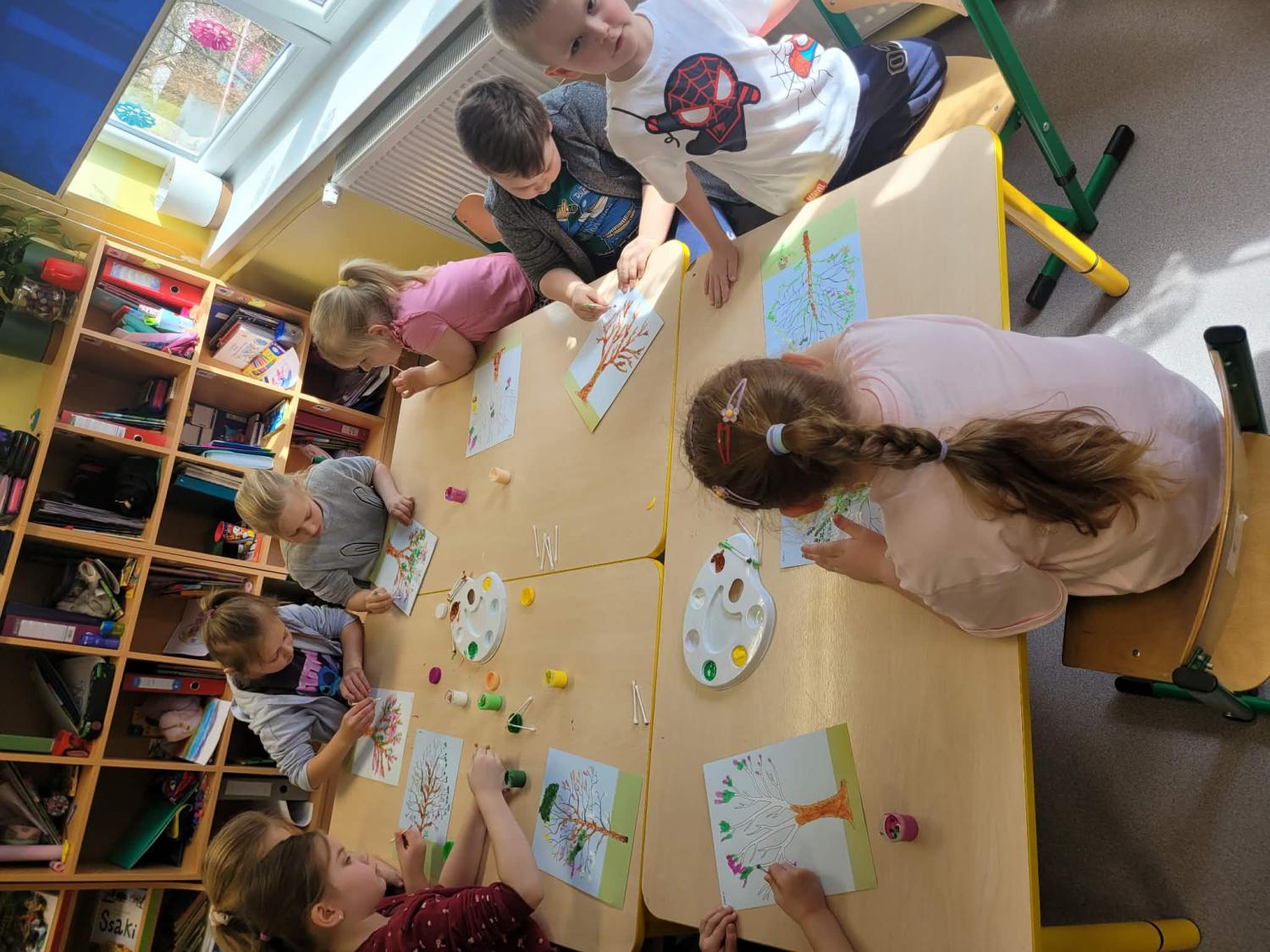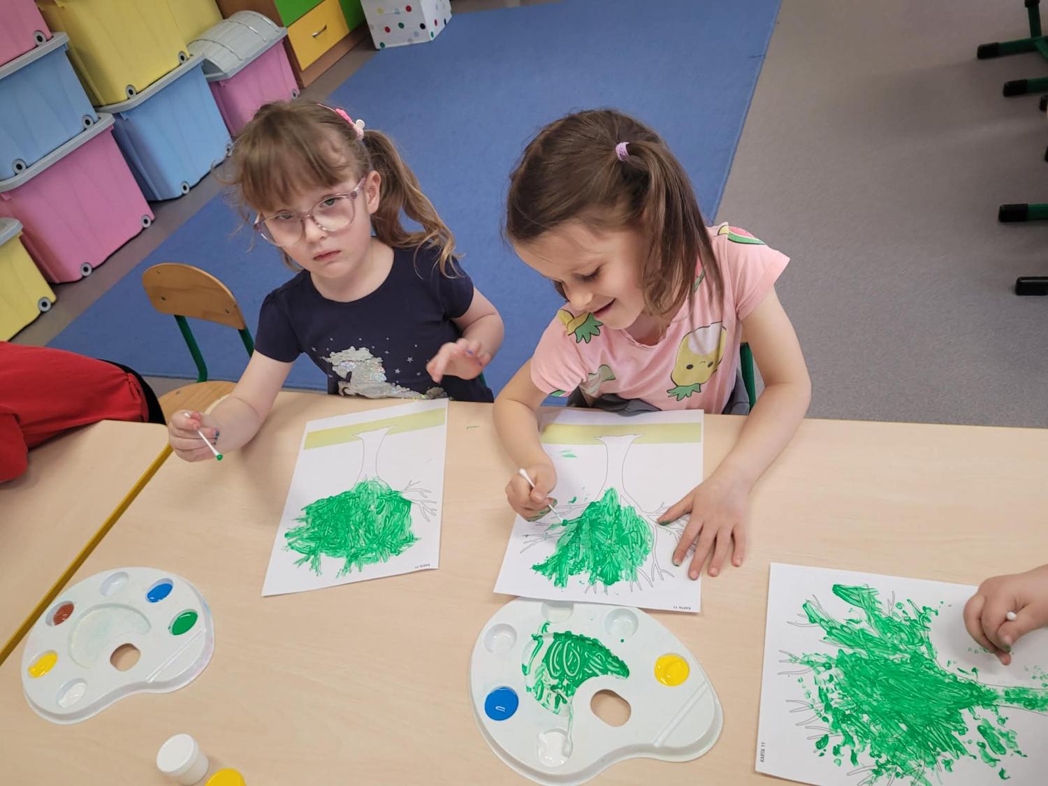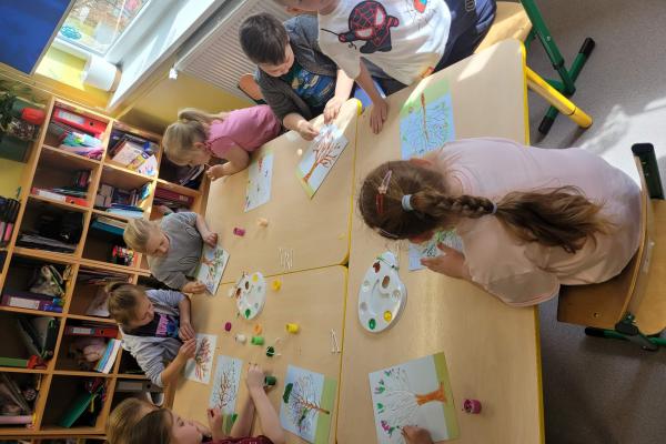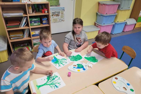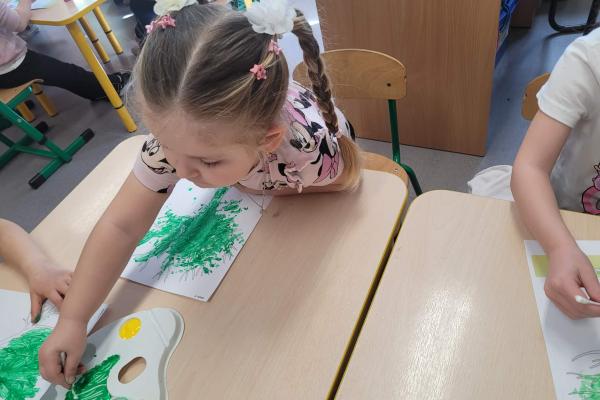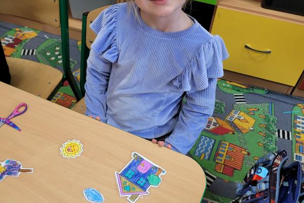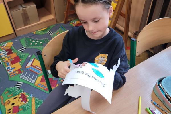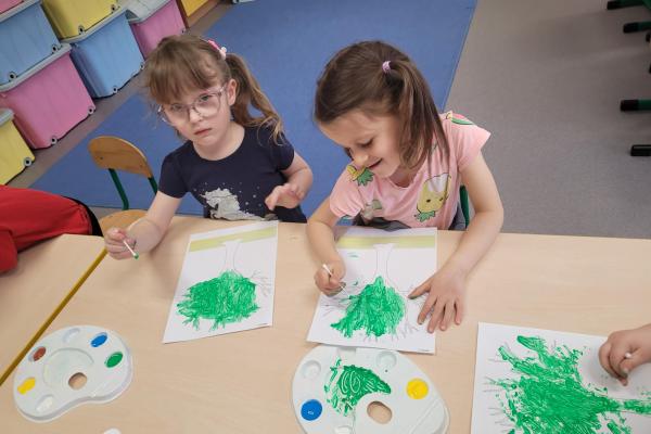 Dzieci rozwijały także swoją kreatywność, wykonując różnorodne prace plastyczno-techniczne inspirowane wiosną. Kolorowe kwiaty, ptaki i wiosenne krajobrazy ozdobiły nasze sale, wprowadzając radosny i pełen energii nastrój.