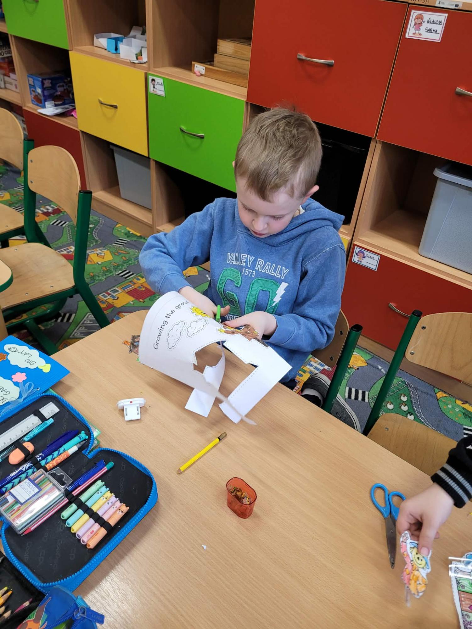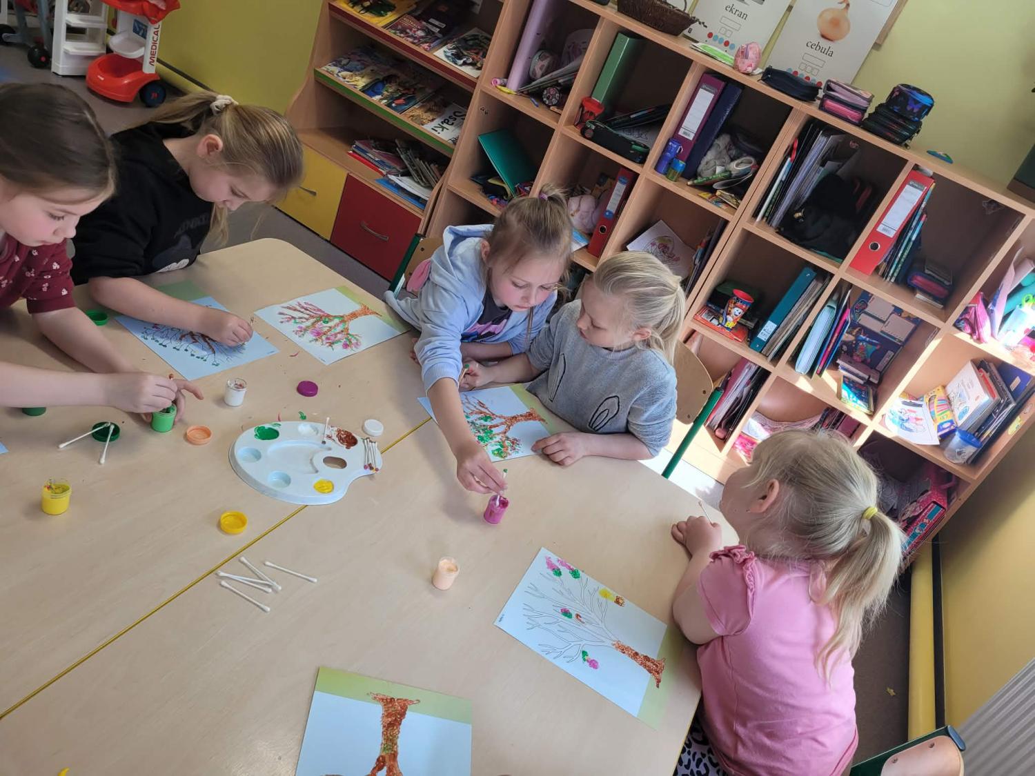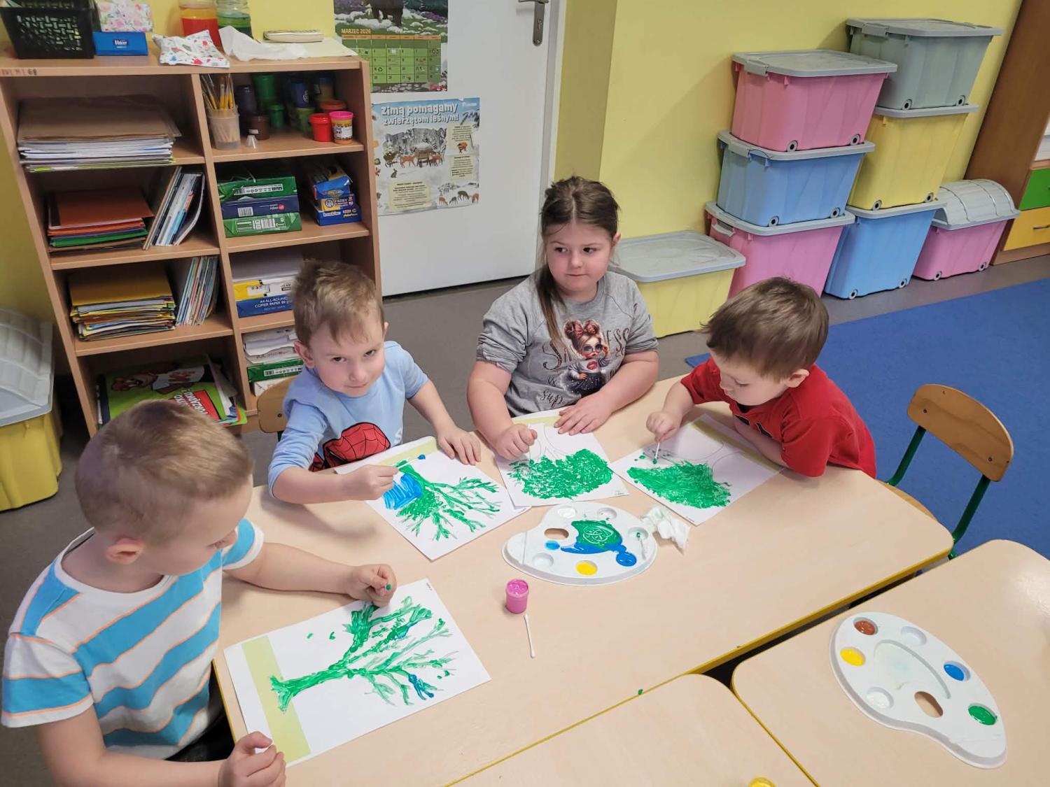Dzieci rozwijały także swoją kreatywność, wykonując różnorodne prace plastyczno-techniczne inspirowane wiosną. Kolorowe kwiaty, ptaki i wiosenne krajobrazy ozdobiły nasze sale, wprowadzając radosny i pełen energii nastrój.
