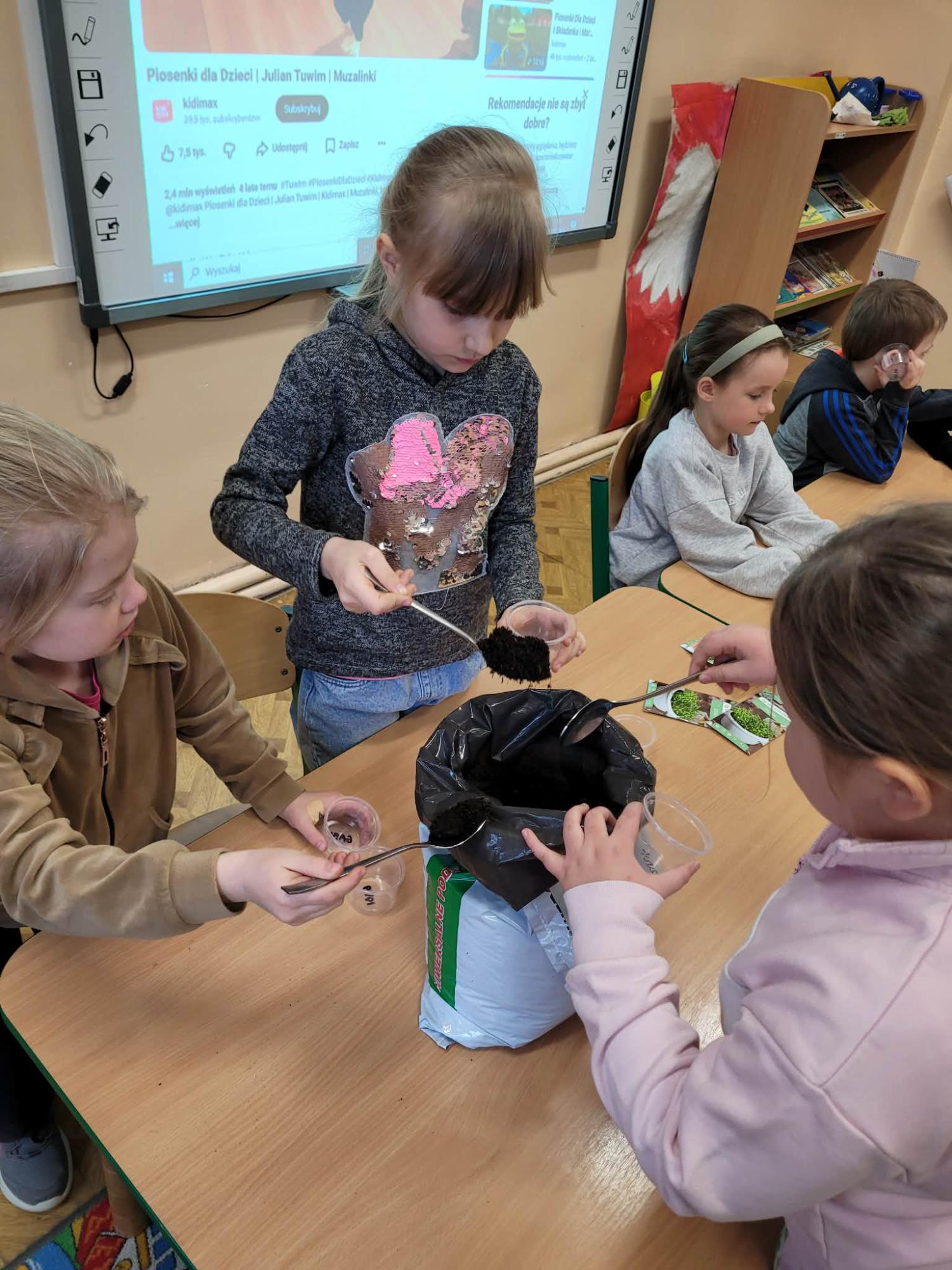 Nie zabrakło także nowoczesnych form nauki – dzieci brały udział w quizach na tablicy interaktywnej, poszerzając swoją wiedzę o wiośnie w ciekawy i angażujący sposób.